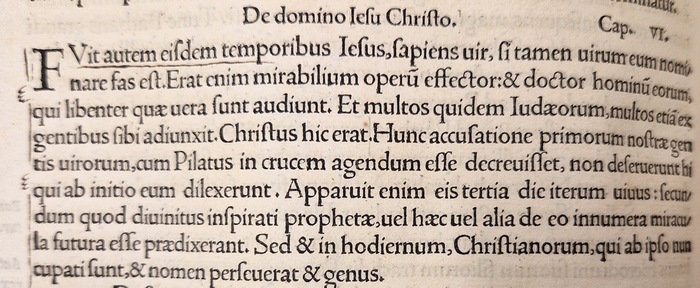 In die tijd leefde Jezus, een wijs mens. Hij verrichtte namelijk wonderlijke daden en was de leraar van mensen die met vreugde de waarheid tot zich namen. Daarom had hij veel Joden en ook veel Grieken als leerlingen. Toen hij door Pilatus, bij wie hij door onze leiders was aangeklaagd, was veroordeeld tot het kruis, weigerden die leerlingen hun liefde voor hem op te geven. Daarom is de naar hem ‘christenen’ genoemde stam nog niet verdwenen.