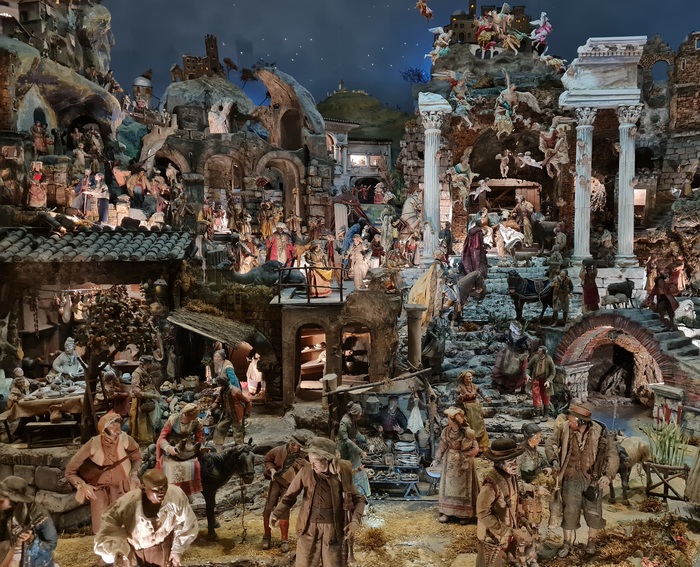 En o ja: de mooiste kerststallen zijn die uit Napels en de grootste Napolitaanse kerststal is in de kerk van SS Cosma e Damiano naast het Forum Romanum in Rome. De Napolitanen voegen niet alleen dieren en koningen toe, maar de halve wereld.