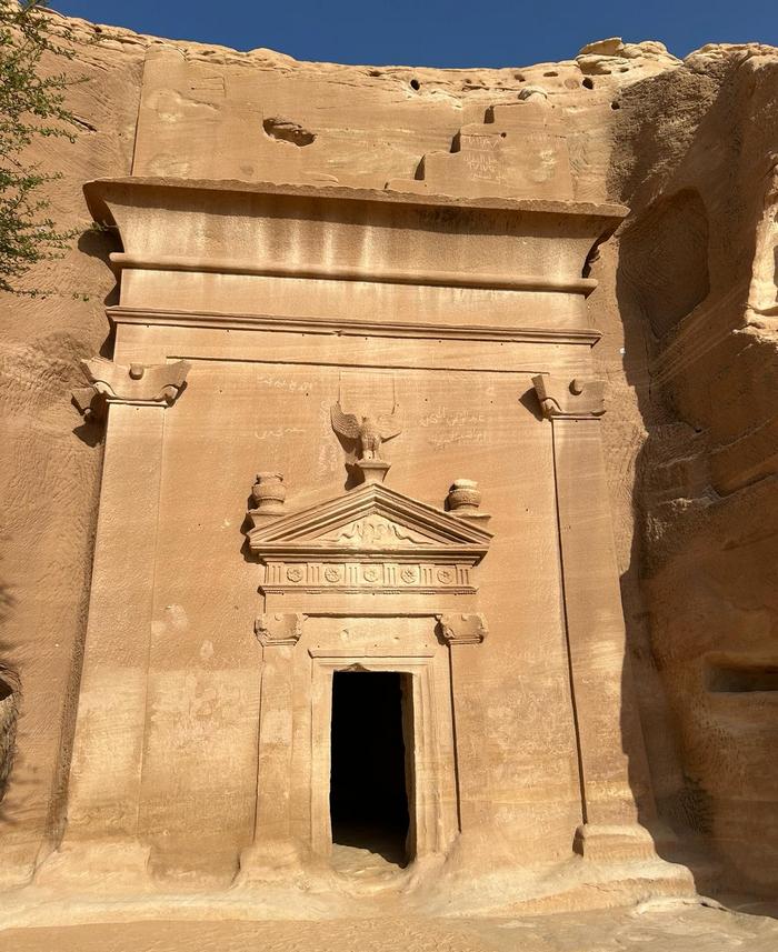 Middenin de Nabatese stad verrees de trotse tempel van “de god van de hemel” en er zijn in de stad maar liefst vierennegentig monumentale rotsgraven geïdentificeerd, vergelijkbaar met die in Petra, en in hoogte variërend van drie tot tweeëntwintig meter. In tegenstelling tot de mausolea in Petra hebben die in Hegra vaak inscripties met de namen van de doden. De meeste zijn geschreven in het Nabatees, een handvol in het Aramees. Archeologen hebben ook gebedsruimtes en baetyls (heilige stenen) geïdentificeerd.