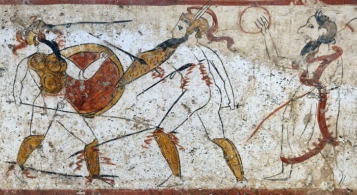 We hebben Nikolaos’ woord voor de Etruskische herkomst van de gladiatorengevechten, maar er zijn nog andere aanwijzingen: iemand die verkleed ging als de Etruskische doodsdemon Charu sleepte de lijken van de gedode krijgers weg, en de naam van de eigenaar van een groep gladiatoren was lanista, een Etruskisch woord.