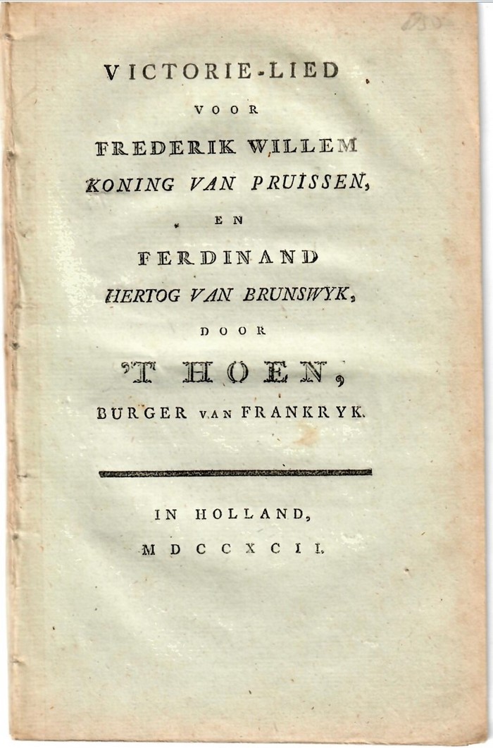 Het Victorie-lied voor Frederik Willem Koning van Pruissen en Ferdinand Hertog van Brunswijk door ’t Hoen, Burger van Frankrijk, is een doorlopend, sarcastisch hekeldicht van vierentwintig pagina’s – twaalf bladen dus – gevat in een pamflet van 13 x 20 x 0,2 cm en gedrukt op stevig lompenpapier. ’t Hoen gaat er met gestrekt been in: