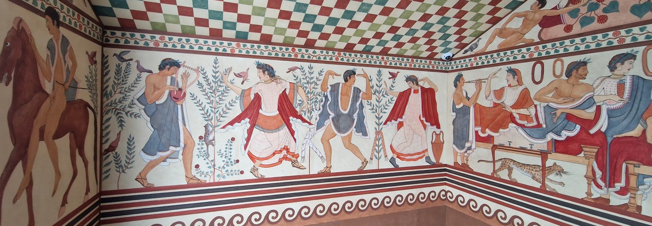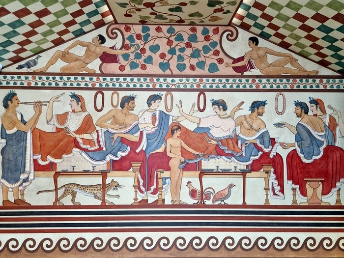 Bij de stad Tarquinia, honderd kilometer ten noordwesten van Rome, zijn diverse grafvelden te zien: soms grafheuvels, soms grafkamers. De interessantste dateren uit het eerste kwart van de vijfde eeuw – de datering is niet helemaal onomstreden – en een van de allermooiste staat bekend als de Tomba del Triclinio, het “graf van de dinerkamer”. Er zijn daar schitterende wandschilderingen te zien van de maaltijd die bij de uitvaart heeft plaatsgevonden.