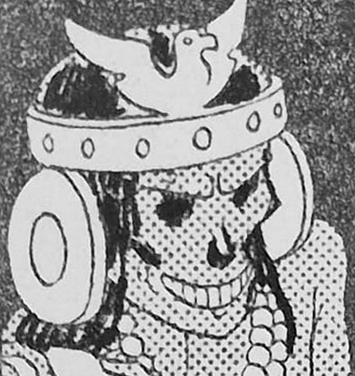… maar in de latere uitgaven verving Hergé die door een beter gedocumenteerde precolumbiaanse kroon. Zie het stripje hieronder. Waar het geen afbreuk deed aan de plot, paste Hergé zijn tekeningen voortdurend aan de laatste inzichten aan.