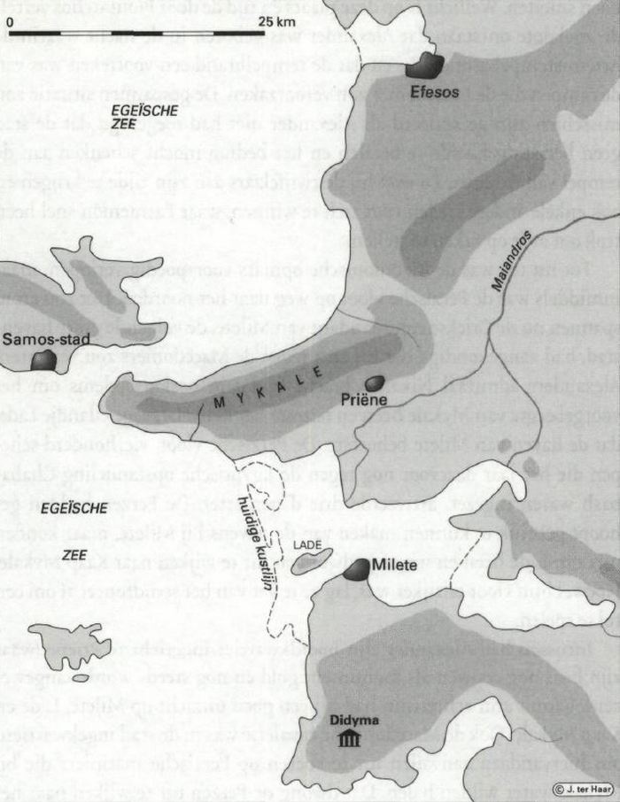 Tot nu toe was de Macedonische opmars voorspoedig verlopen, maar inmiddels was de Perzische vloot op weg naar het noorden, naar Milete. Het zou erom spannen, want de Griekse commandant van de grote havenstad had aangekondigd dat hij zich zou verzetten tegen de Macedoniërs. Alexanders admiraal Nikanor bracht snel zijn oorlogsbodems om het voorgebergte van Mykale heen en bezette het heuvelachtige eilandje Lade, dat de haven van Milete beheerste. (Het bestaat tegenwoordig niet meer als eiland omdat de baai is dichtgeslibd.)