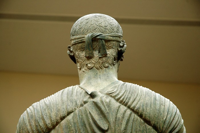Er is een hoop over te vertellen. Om te beginnen vermeldt een inscriptie dat het beeld is vervaardigd in opdracht van de alleenheerser Polyzalos van Gela, wiens paarden in 478 en 474 v.Chr. de vierspanrace wonnen tijdens de Pythische Spelen. Bij een van deze twee gelegenheden heeft Polyzalos, die het mennen overliet aan een jockey, een standbeeld ter ere van de jongeman en de paarden. (Van de vier paarden zijn fragmenten over.) Het beeld is vrijwel zeker gewijd geweest aan Apollo – het idee dat het gewijd kan zijn geweest aan een andere god dan de god van Delfi, is ronduit absurd.