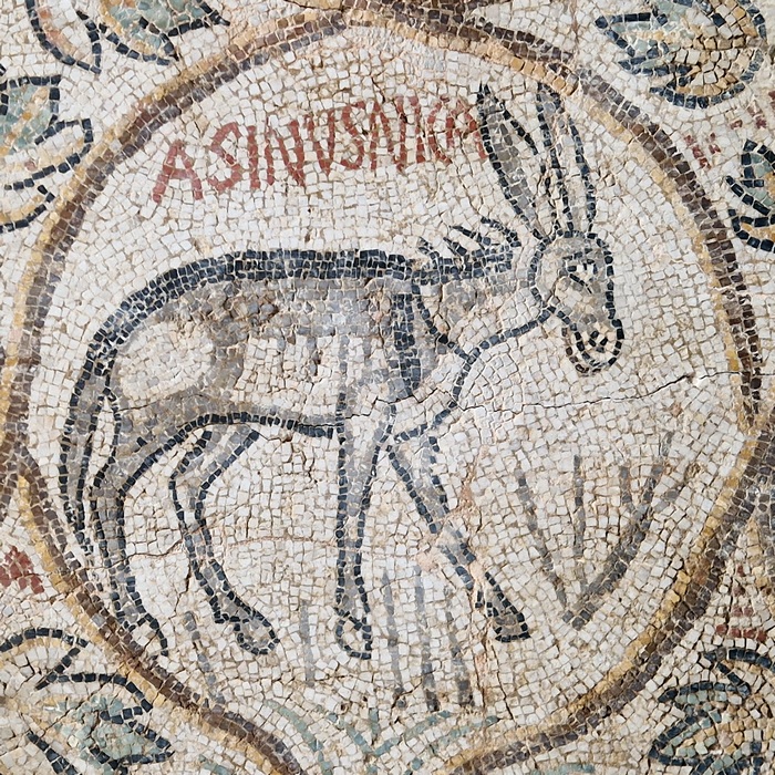 Het bovenstaande Romeinse mozaïek, dat dateert uit de late vierde of vroege vijfde eeuw na Chr., is te zien in het museum van Djemila in Algerije, de antieke stad Cuicul. Het opschriftnoot combineert het Latijnse woord voor ezel, asinus, met de in Latijnse letters geschreven Griekse strijdkreet nika, “win!” Het woord kan ook verwijzen naar de personificatie van de overwinning. De ezel moet dus winnen, of heeft gewonnen, of zal winnen, of overwint – de strekking is duidelijk. De zegevierende ezel was duidelijk iets dat de eigenaar in wiens huis dit is gevonden, en dat de opgravers heel origineel “maison de l’âne” hebben genoemd, na aan het hart lag, want het motief is herhaald. Dus wat betekent het?