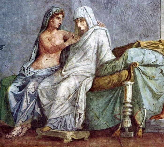 In Griekenland was het niet anders. Talloze vaasschilderingen tonen hoe een jonge vrouw een hoofddoek krijgt bij haar huwelijk. Hier is een voorbeeld, afkomstig uit het vijfde-eeuwse Athene.