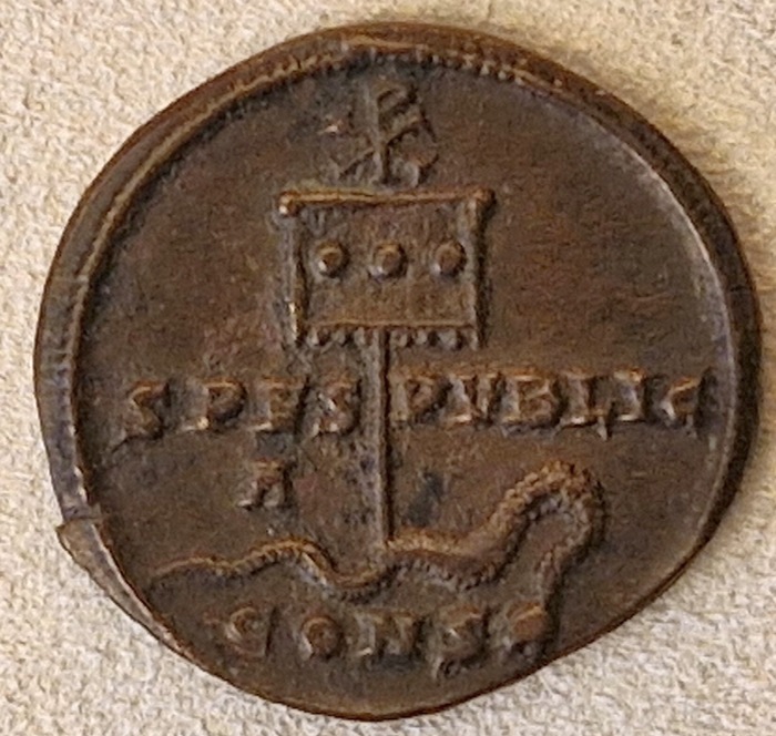 Munt van Constantijn de Grote, kort na de oorlog tegen Licinius: bovenaan Constantijns veldteken, op de banier de portretten van Constantijns drie zonen (Bodemusem, Berlijn)