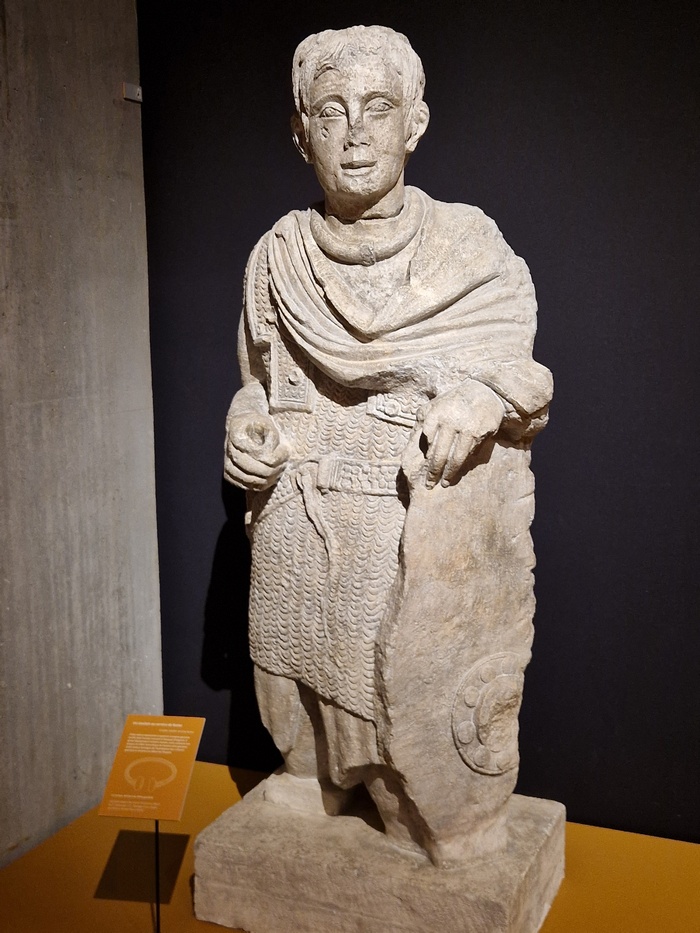 De bovenstaande Gallische inscriptie is in 1839 gevonden in Alise-Sainte-Reine, en hielp om vast te stellen dat dat heuveldorp het antieke Alesia moest zijn geweest, waar Julius Caesar een belangrijke overwinning boekte op de Galliërs. De vorm is echter heel Romeins: een stuk kalksteen met daarin uitgehouwen een vierkant vlak, netjes omlijst met links en rechts twee driehoekige vleugeltjes. Zou het een Latijnse inscriptie zijn, dan zouden we het een tabula ansata noemen. De tekst is trouwens geschreven in Romeinse letters en een ligatuur, met leuke fleurons tussendoor, wat ook al bijdraagt aan het Romeinse aanzicht.