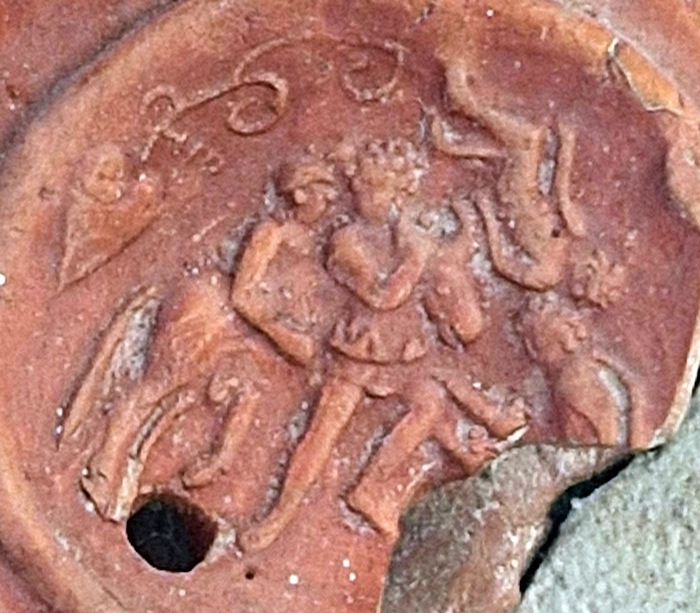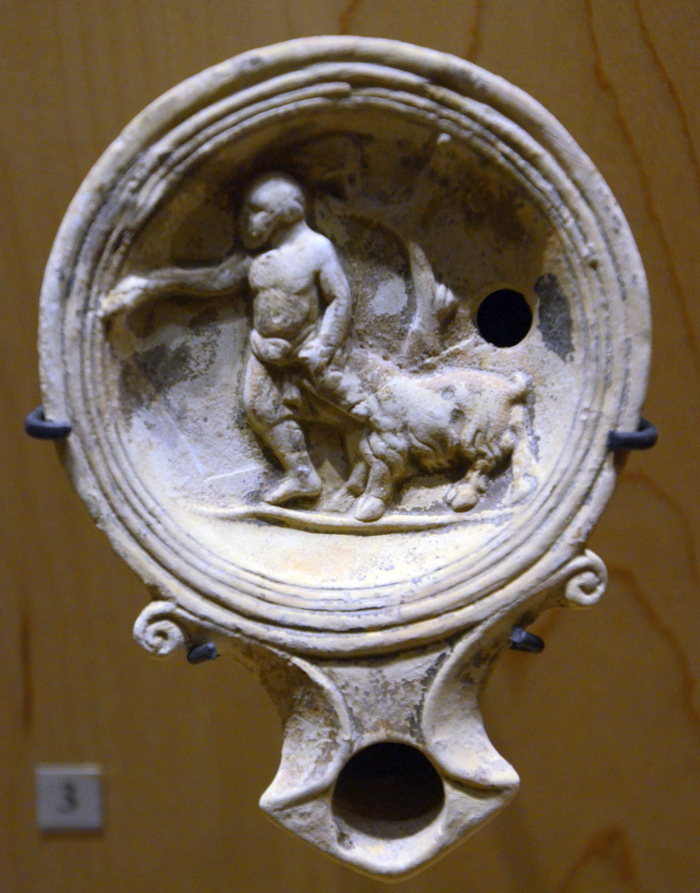 Meestal zie je op een olielampje een vrij eenvoudige afbeelding: een bloem, een dier of een fabeldier, een gladiator, een godheid of (in de Late Oudheid) een christogram. Dit keer is de afbeelding wat complexer: een stierengevecht. Drie mensen zijn bezig met het temmen van een woeste stier; een ervan heeft het dier bij de hoorns gevat, een tweede pakt het dier bij de voorpoten; de derde lijkt de voorpoten vast te hebben genomen, al is het voorwerp precies daar beschadigd. Nummer vier is door het ondier de lucht ingeworpen. Omdat de maker van dit olielampje boven de scène nog een fleuron heeft afgebeeld met een lange kronkelige steel, lijkt het alsof de hemelpiloot een salto heeft gemaakt.
